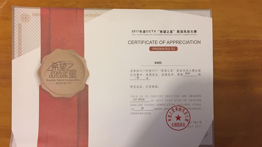 在此,我们向王芊力、李炳东两位同学表示衷心祝贺,也希望有更多的同学能珍惜时光,好好学习,把握机会,展示自我。(文/中学部初中英语组 图/学生家长)