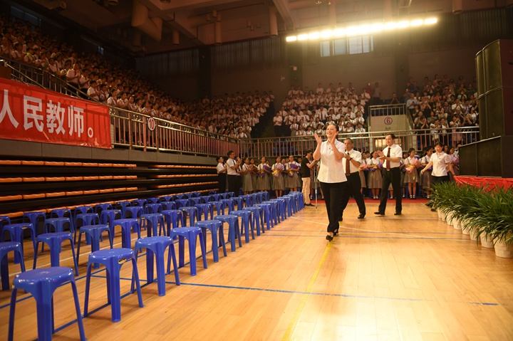 随后,中学部的四位学生代表用饱满激情献上朗诵《教师颂》,传达了实验学子对老师辛勤付出的感恩之情。由赵丽媛老师、唐尧老师指导的高一年级学生演唱的大合唱《老师,我总是想起你》,把对老师的爱寄托在悠扬的旋律和欢快的节奏中,传递着学生对老师的浓浓深情。最后,在优美旋律中,同学们将手中的一束束鲜花敬献给敬爱的老师们,以此感谢老师们对我们精心的呵护和培育,感谢老师对我们无私奉献。