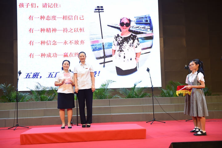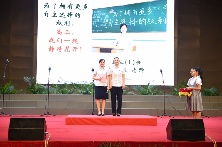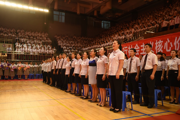伴着清晨的阳光,踏着激昂的旋律。在全校学生的掌声和欢呼声中,龙校长带领着中学部的全体教师,踏着坚定的步伐,挥手步入会场。大会在嘹亮的国歌声中拉开了帷幕。