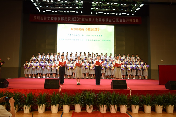 九月爽朗的秋风,迎来了新学期的期许;九月硕果的飘香,奏响了教师节的序曲。9月8日清晨,深圳实验学校中学部在校文体馆隆重召开第33个教师节大会暨年级主任、班主任的拜授仪式。全校师生以及应邀的家长参加了本次大会,大会由学生处杨宁主任主持。