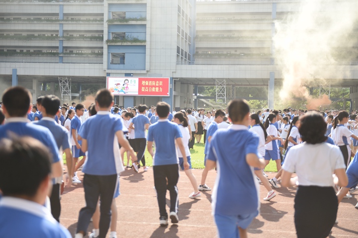 当天下午2点整,高中年级学生宿舍楼警铃响起,“宿舍消防安全疏散演习”正式开始,在龙校长和老师的指挥下,全部学生迅速有序地通过安全通道到达指定集合地点。下午3点55分,全校师生在教学楼又进行了“安全消防疏散演习”。一阵急促的警铃响起后,烟幕弥漫,东、西两座教学楼内的全体学生,在老师们的指导下,俯下身子,手捂口鼻,在三分钟之内,全部集结在大操场的指定区域。