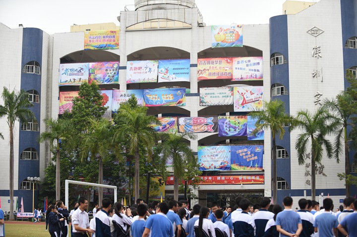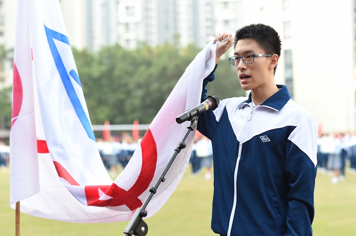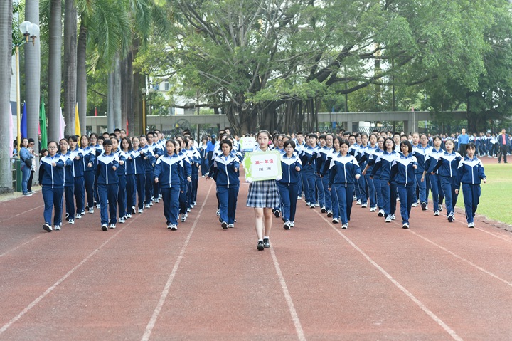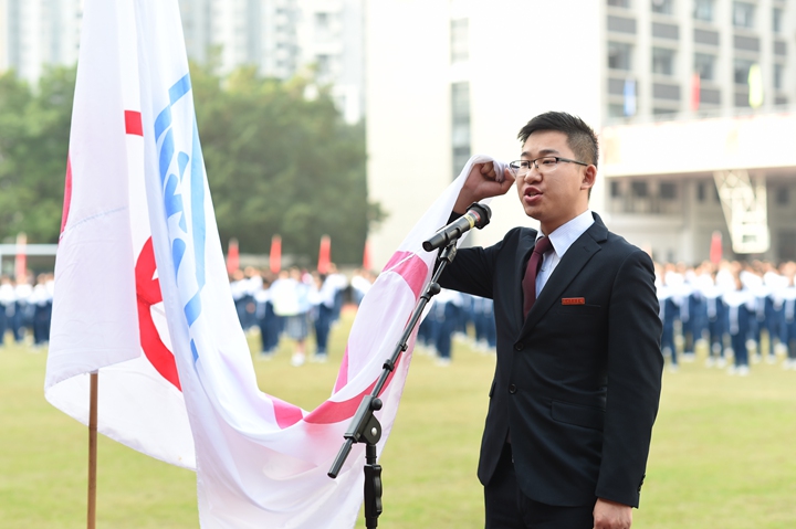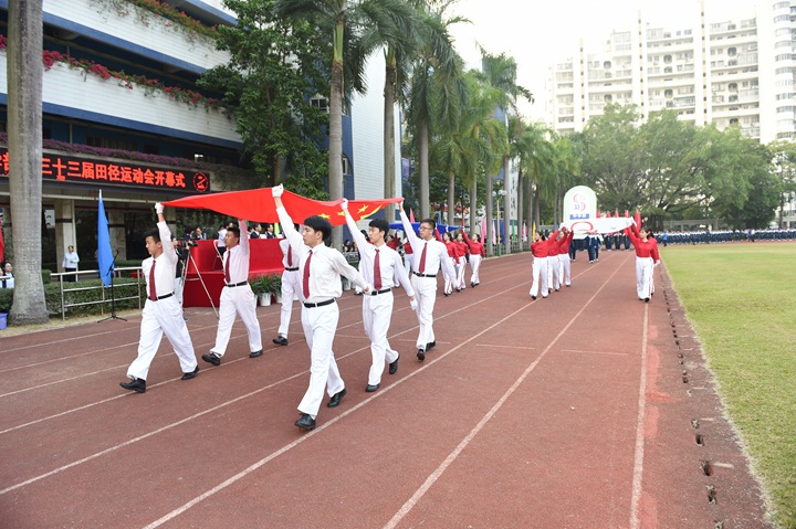 迎着鹏城十二月煦暖的阳光,校园内,彩旗迎风招展,运动健儿们踏着坚实有力的步伐有序入场。他们口号响亮,步伐矫健,英姿飒爽,象征实验人文精神的生生不息。各班方阵一一走过主席台,整齐的步入运动场,以必胜的信心和饱满的激情接受领导、老师和家长们的检阅。入场式结束后,衷敬高校长宣布本届运动会开幕!中学部副部主任教务处王兵主任致开幕词,她期望:新时代的中学生,不仅应该具有高尚的品德、优异的成绩、深邃的思想、优雅的举止,还应该具有强健的体魄,必须学会强身健体,真正成为全面发展的优秀人才。这不仅关系到你个人的健康,更关系到一个家庭的幸福和国家的兴旺。运动员代表高三(3)班张文远、裁判员代表唐尧老师先后宣誓,高亢的声音、掷地有声的誓词,传递出对比赛的高度投入和认真负责。开幕式上,各班进行了广播操比赛,在平时严格要求、强化培训后,同学们展现出动作有力,举手、抬脚、弯腰、转身、跳跃整齐统一,动作中充满着自信,在实验蓝白相间运动服的陪衬下,彰显出实验学子朝气蓬勃,团结向上的精神风貌。
