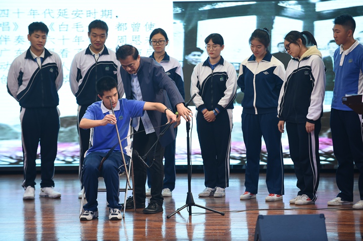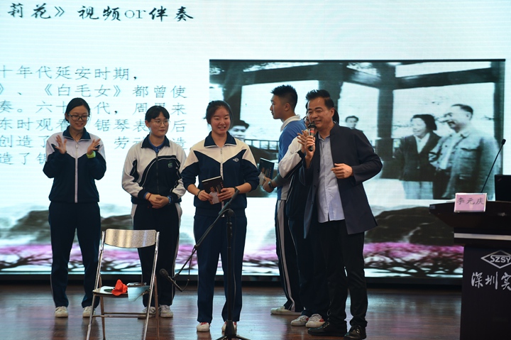 12月25日下午4:05,中学部高一高二全体师生齐聚小礼堂,聆听著名锯琴演奏家李元庆老师讲述锯琴的魅力。