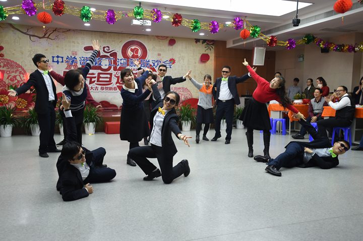 晚餐过后,在龙校长真诚的新年祝福中,迎新联欢会正式开始。整场晚会形式多样,流行与古典兼收;内容精彩,温暖与激情并举。热情的开场舞,初三年级老师们带来的现代舞《Gentleman》,备战中考非常时期的舞台剧,串入了活泼动感的现代舞,台上精彩非凡,台下连连叫好。欣赏了火热的青春热舞,接下来奉上了一曲空寂辽远的歌,由高二黄吉祥老师独唱了一首《天边》。高一老师带来的小品表演《朱老师的语文课》更是让观众捧腹大笑、乐不可支,幽默风趣的台词,滑稽搞笑的动作引得观众们掌声连连,欢笑不断。青春总是火辣,青春总是洋溢,青春总是让人向往,由30余位青年教师组成的“实验人”团队,带来了歌曲串烧,《风吹麦浪》《我爱你中国》轮番上场,或浪漫温馨,或轻快悠扬,或高亢激昂。