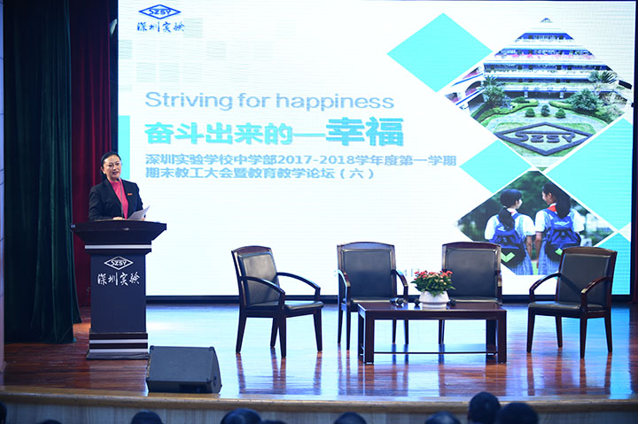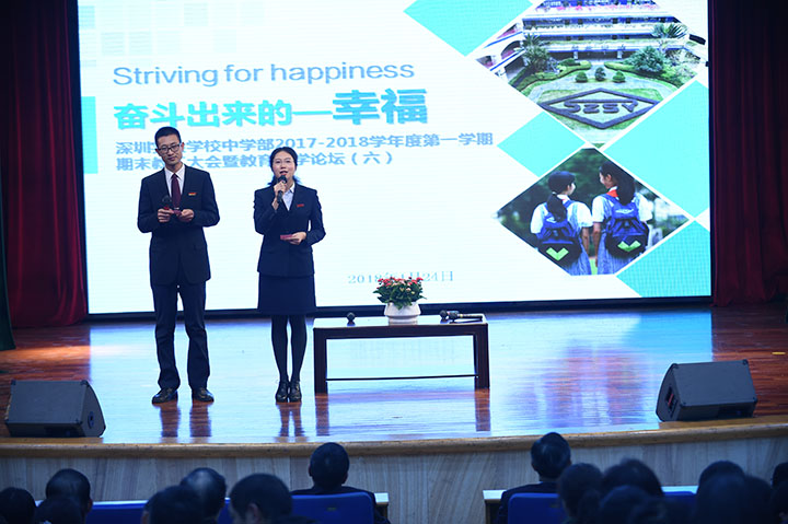 1月24日下午,深圳实验学校中学部教工大会暨教育教学论坛在六楼小礼堂隆重举行。本次大会的主题是“奋斗出来的——幸福”。国家主席习近平发表了二〇一八年新年贺词,贺词提到:“幸福都是奋斗出来的。”回顾本学期,中学部教工们都收获到了奋斗的幸福!