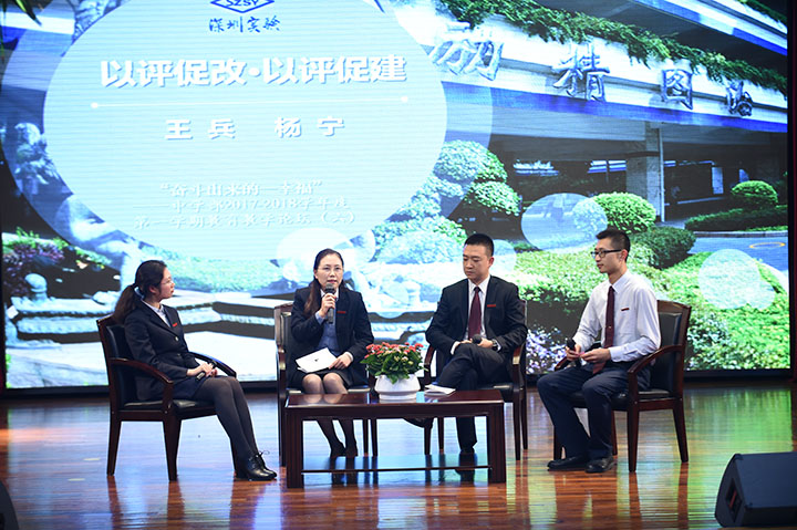 论坛的第三版块是办学水平评估访谈,请到了王兵主任和杨宁主任作为嘉宾,围绕评估组意见与建议进行了思考与探讨。本学期,中学部迎接了“深圳市义务教育阶段学校办学水平评估”,所有老师齐心协力迎评估,最终顺利通过,并且得到了专家组的高度评价。同时,评估小组也提出了一些进一步完善的意见与建议。两位主任针对这些建议与老师们一同探讨,比如搭建平台让更多的老师去提高自身的水平,加强课题的申报与教师科研的落实;还有提升班级文化的建设,软文化硬文化兼顾发展,进一步深化学生工作;改善学生学习方式,组织更多的学生讨论等生生互动形式,让学生在“伙伴”关系中得到更多的发展;还有,关注学生差异,加强对学困生的鼓励与帮助。两位主任结合评估组的建议与自己的意见,为我们指明了接下来需要努力的方向。