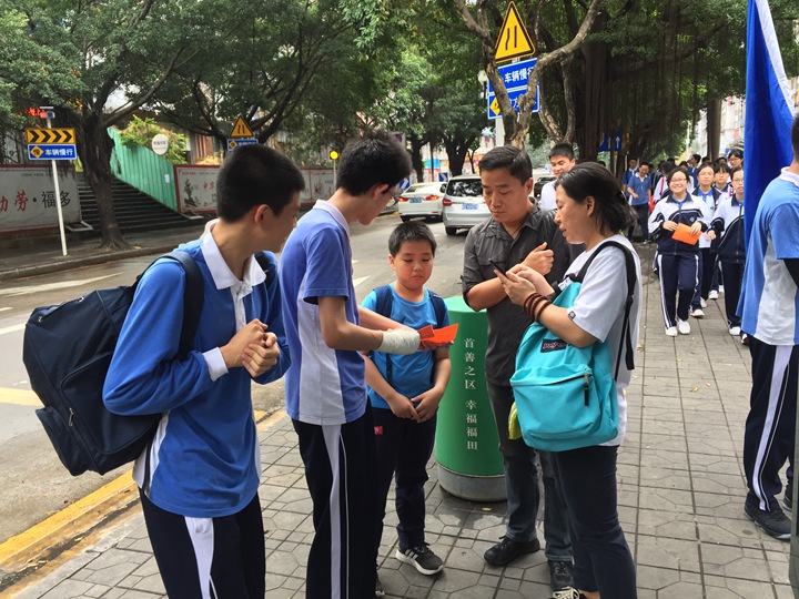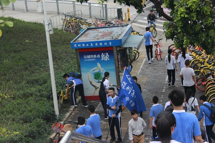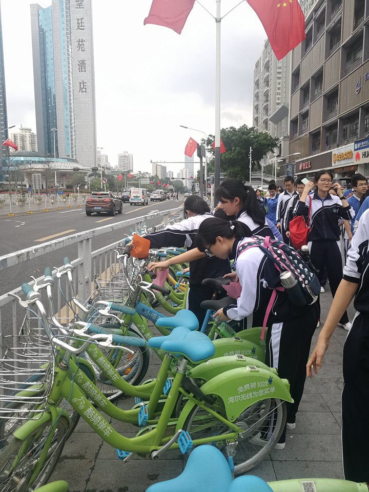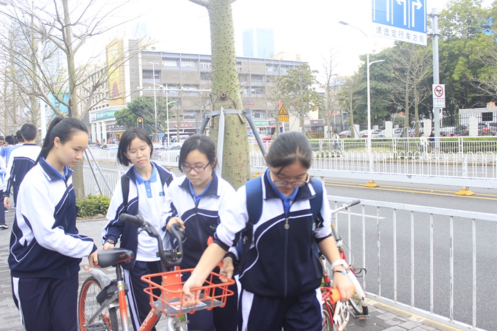 3月4日下午2:30,由团委学生会成员组成的队伍高举实验校旗,浩浩荡荡地从学校出发了。根据前期计划安排,这次活动的主要任务是整理百花、华强北片区共享单车乱停乱放问题,还有在损坏的单车上贴上便利贴予以温馨提醒。沿途,同学们积极主动地整理零散摆放的单车,在损坏的单车上贴上画着笑脸的便利贴提醒使用的人,看着一排排整理过后井井有条的单车,不少行人驻足,不经意间露出肯定的微笑。
