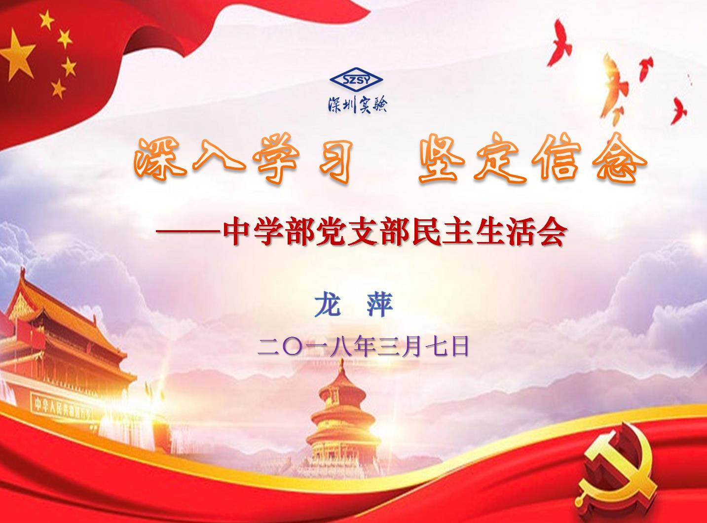 三月的雨,惬意悠闲;三月的风,吹面不寒;三月的光,明媚绚烂;三月的梦,满是香甜。3月7日下午,恰逢全国“两会”期间,为深入学习贯彻十九大精神,为进一步发扬党的优良传统,保持党支部的先进性,中学部全体党员欢聚一堂,开展了主题为“深入学习,坚定信念”党支部民主生活会。会议由中学部党支部伍妙贞副书记主持。