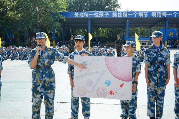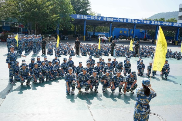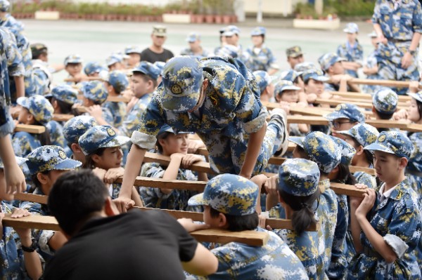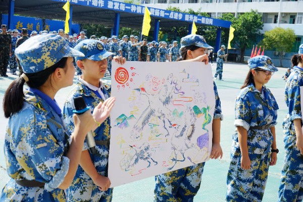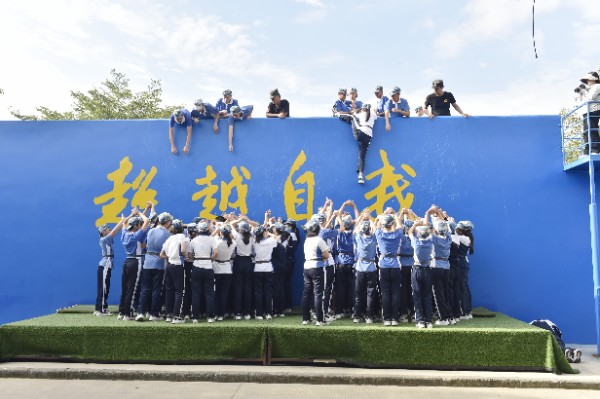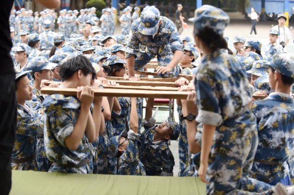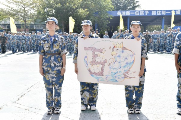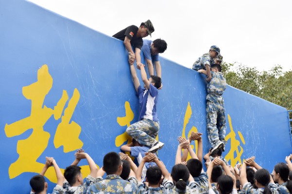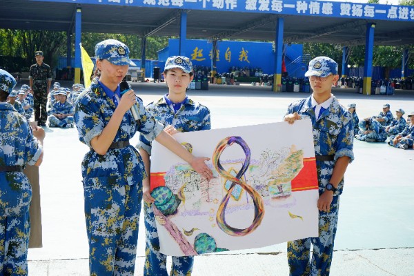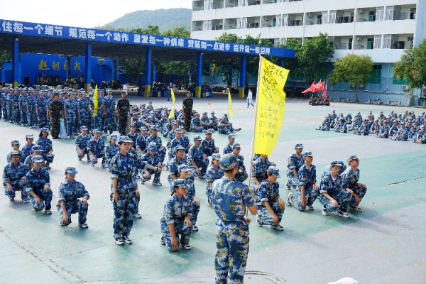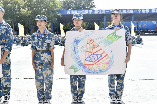 八年级的军训以团队合作为主,所以活动除了列队训练,还增加了队旗制作、队列队形训练、团队浮桥、翻越成功墙等团队拓展活动。队旗上的图案本没有意义,精神的浇灌使它变得鲜活;队列队形所摆出的虽然只是最简单的数字,图案或文字,然而团队的解说体现了对班级的寓意和期盼;浮桥上勇于挑战自我的攀爬者,浮桥下用肩膀固定浮桥的支撑者,浮桥旁跑动的安保人员,台上为团队喝彩的队员。他们是一个团队,缺一不可,因为团结,信任和勇气,他们无坚不摧,无所不能;翻越成功墙时,团队成员们自觉分工,有些做桩,甘于作为托起队员的人梯,有些举起双手,为队友提供一份安全保障,有些向队友伸出手,将他们拉上成功的彼岸……这些活动不仅磨练了意志,形成了良好的纪律观念,而且培养了队员团结协作的精神,为较快的形成一种积极向上的班风和班级凝聚力奠定了基础。