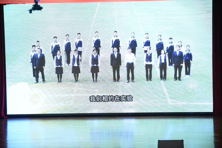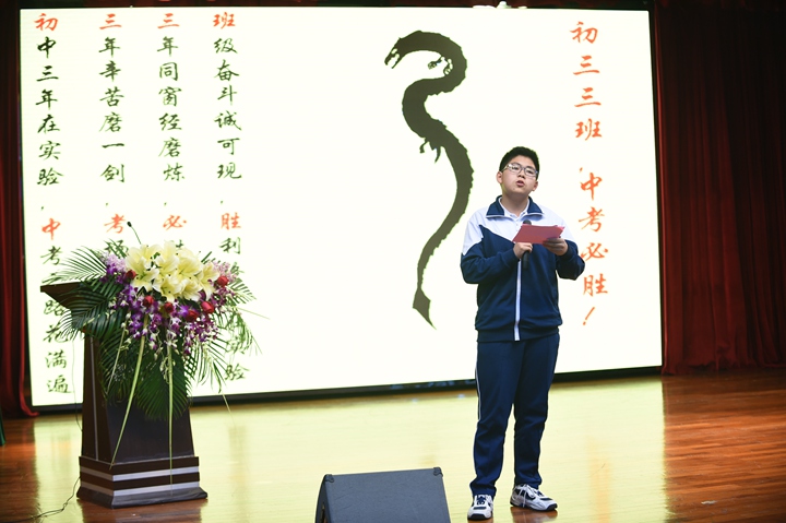 大会在庄严的国歌声中拉开帷幕。全体师生一同观看由初三年级策划、电教室精心制作的电视短片《相约实验》,短片回顾了年级全体师生三年来努力拼搏的历程,片尾,在北京开会的龙校长特地发来视频,为同学们加油,并希望同学们不负父母的期盼,不负恩师的厚望,不负学校的荣光,不负青春,奋力拼搏。