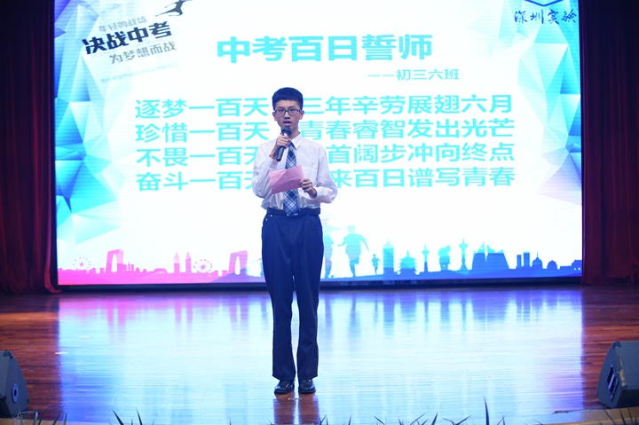 怀揣父母的期盼,肩负老师的厚望,全年级8个班的同学依次发出自己的铿锵誓言,以气吞山河之势向中考发出挑战:充满自信,斗志昂扬;全力以赴,竭力向上;勤学巧练,保质保量;惜时如金,效率至上;永不言弃,互学互帮;超越自我,勇创辉煌!百日冲刺,我们无所畏惧,挑战极限!百日冲刺,我们大胆心细,斗志昂扬!百日冲刺,我们与时间赛跑,惜时如金,发奋图强!百日冲刺,六月翱翔,我奋斗,我自信,我成功,我辉煌!铮铮誓言,在校园回响,实验学子,将以实际行动,在青春画册里留下精彩的一章。