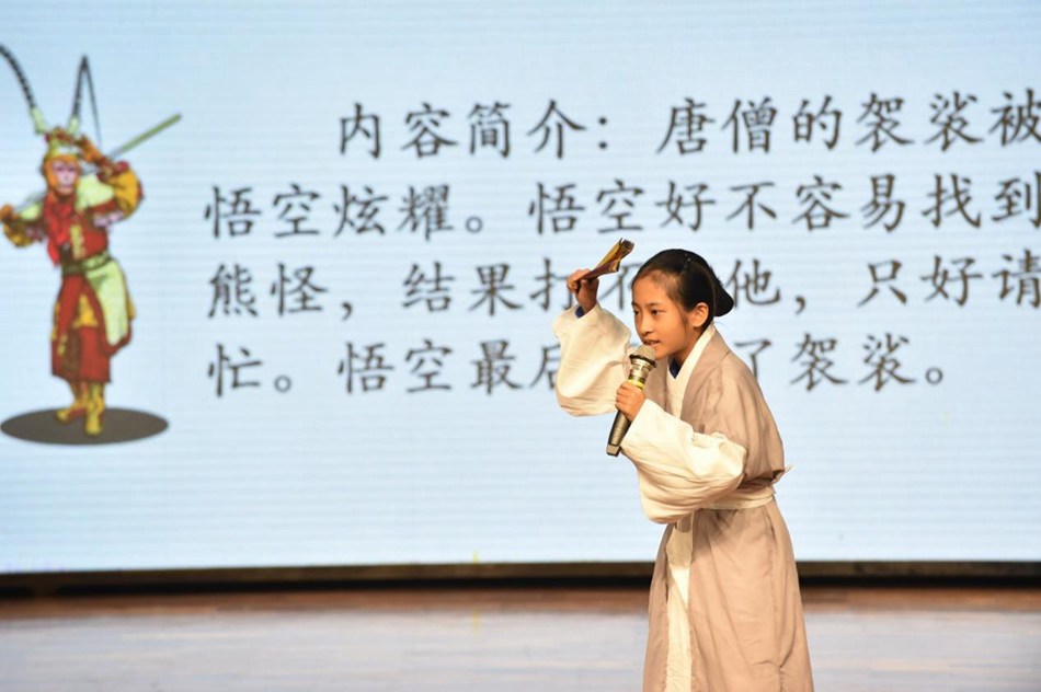 获得特等奖的八位同学获得了在年级展示的机会,他们在舞台上展示了自己独特的风采。这些班级佼佼者不负众望,他们一个个形神兼备、学声情并茂,风格迥异却同样精彩,妙语连珠,把原本就妙趣横生的西游故事讲述得更加引人入胜!