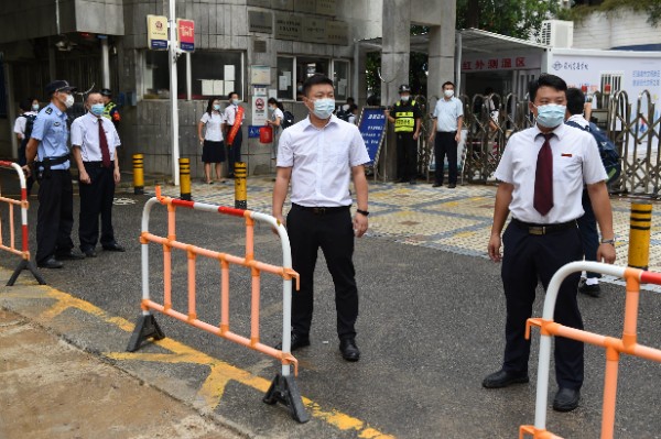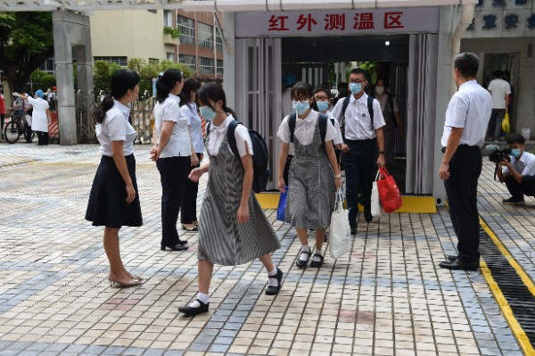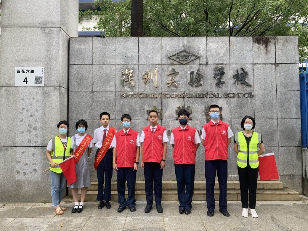 7点20分,深圳实验学校副校长、中学部执行校长龙萍带领行政干部在校门口迎接学生返校。在老师、学生义工、家长义工的组织下,同学们保持一米以上的安全距离,在进行红外线体温测试之后,依次进入校园。寂静的校园,顿时显得生机勃勃。