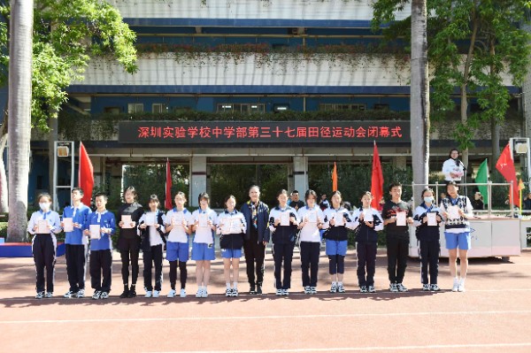 3日上午11时,中学部第37届田径运动会闭幕式在田径场隆重举行。学生处高丽副主任主持闭幕式。总裁判长李文广老师宣读了各班级团体总分名次和突破校记录的运动员及项目名单,最终共有19项个人及集体项目成绩打破校记录。中学部校领导依次为获奖个人、获奖班集体颁奖,龙校长热情地走上颁奖台,为冠军运动员颁奖并合影留念。