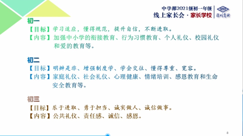 【年级家长会】为实现家校共营、家校共赢,中学部初一年级开学初即召开了年级线上家长会。深圳实验学校副校长、中学部执行校长龙萍在讲话中希望家长们做好孩子的榜样,在孩子成长的过程中,帮助他们养成良好的习惯;同时要注重孩子的身心健康,关注孩子的情绪变化,必要时寻求科学的方式帮助他们。龙校长强调,学校各项教育教学工作的开展都遵循教育规律和孩子们的成长规律,希望家长尊重学校的安排,同时为学校的发展建言献策。家长会上,龙校长表态,中学部全体老师定会平等、公正地对待每一位学生,也请家长用实际行动来理解和支持老师们的工作。