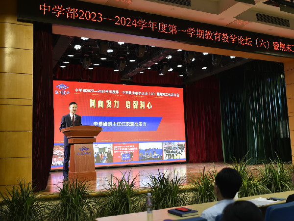 2024年1月18日下午,中学部全体教职工在小礼堂集中,召开了本学期第六次教育教学论坛暨期末工作总结会,活动主题为“同向发力,启智润心”。论坛旨在通过交流与讨论,梳理总结办学成绩,增进团队凝聚力,提升教育教学质量,促进中学部教育事业的全面发展。