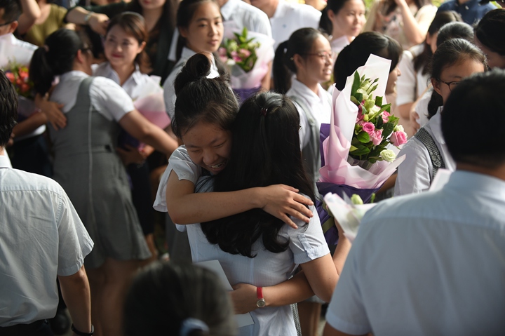 滋养三年,受益终身,这拳拳师生谊、悠悠母校情,在礼堂里穿梭激荡,经久不绝。最后,学生代表为领导和老师们送上美丽的鲜花,深深鞠躬表达敬意。随着骊歌响起,每位同学都与自己亲爱的老师们一一握手、拥抱道别,并送上最真挚的祝福。一句句感恩的话语,一声声加油,一个个深情的拥抱……三年的陪伴与关怀,师生间的情谊将永远烙印心底。
