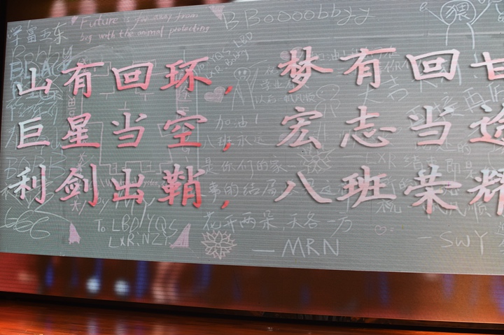 接着,是各班班级文化展示环节,各班代表依次上台,带着他们特有的回忆,让师生们领略了各班的风采,一声声班级口号,一张张班级合照,一个个班级故事,无不展现着各班这三年独有的默契与感情,散发着珍珠般的光芒。