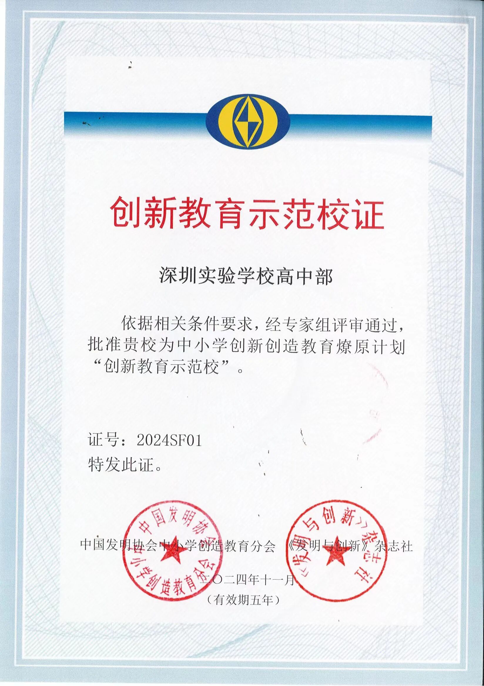 2024年11月8日,在中国发明协会中小学创造教育分会、《发明与创新》杂志社主办的2024全国中小学创新教育研讨活动中,我校高中部获评“创新教育示范校”、高中园获评“创新教育试点校”。