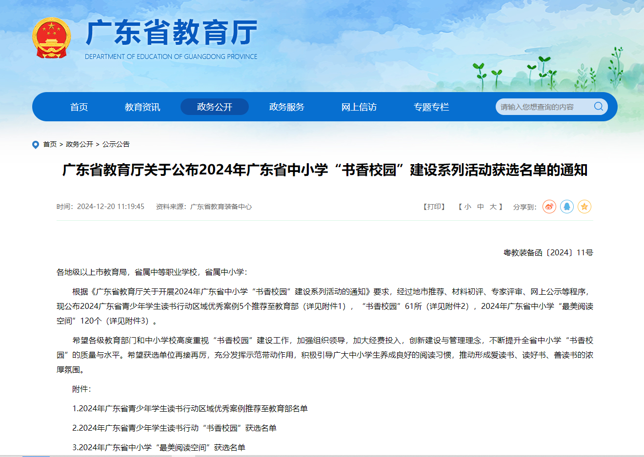2024年12月20日,广东省教育厅公布了2024年广东省中小学“书香校园”建设系列活动获选名单,我校初中部图书馆获评广东省中小学“最美阅读空间”。