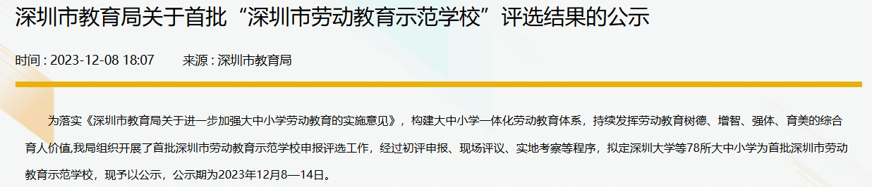 2023年12月8日,深圳市教育局公示了首批“深圳市劳动教育示范学校”评选结果,我校坂田部成功获评。
