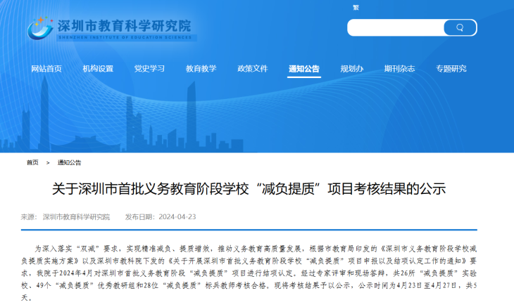 2024年4月23日,深圳市教科院公示了深圳市首批义务教育阶段学校“减负提质”项目考核结果,我校中学部道德与法治教研组获评“减负提质”优秀教研组。